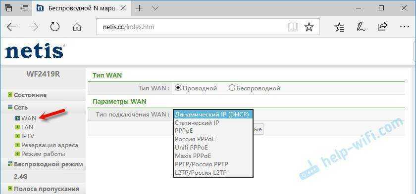 Дальше переходим слева на вкладку Сеть – WAN. Здесь находятся очень важные настройки, если их задать неправильно, то роутер Netis WF2411 не сможет подключится к интернету и раздавать его. Какой тип подключения использует ваш интернет провайдер, вам нужно уточнять у самого провайдера. Это может быть: Динамический IP, Статический IP, PPPoE, L2TP, PPTP. Если у вас тип соединение не Динамический IP, то у вас так же должны быть параметры для подключения: имя пользователя, пароль, и возможно IP адрес. Эти данные выдает провайдер.