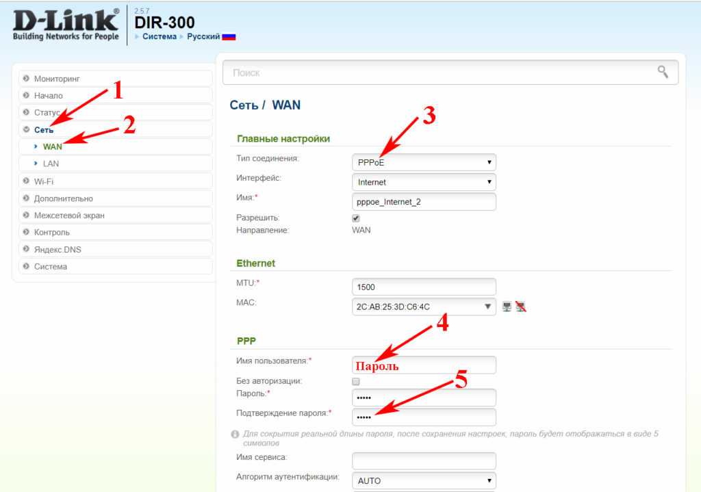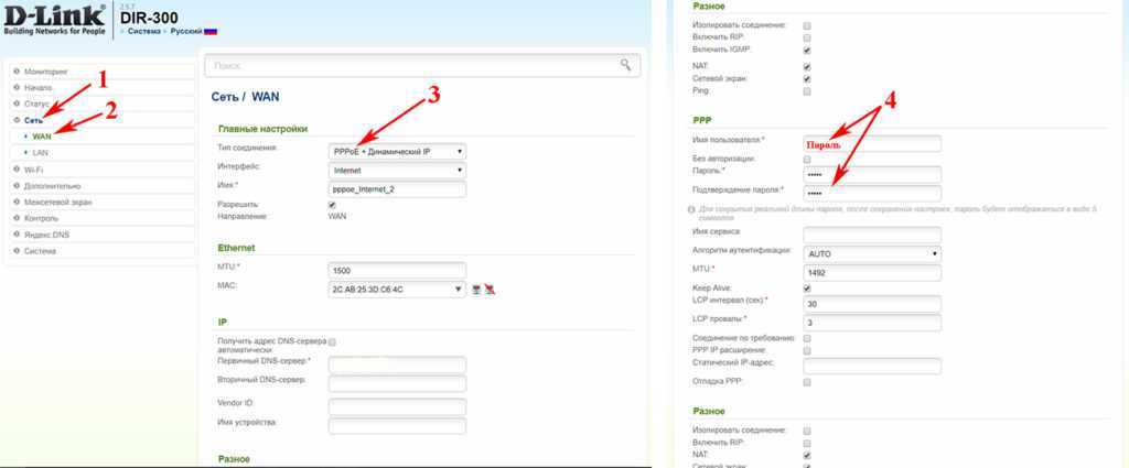 Настройки выставятся автоматически, вводить нужно только логин, пароль в разделе PPP.