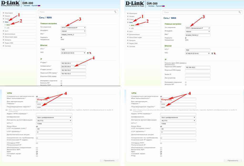 Данный способ предусматривает введения настроек вручную: айпи адрес, сетевая маска, айпи адрес шлюза, первичный и вторичный ДНС сервер. В пункте PPP необходимо ввести «Пароль, логин».