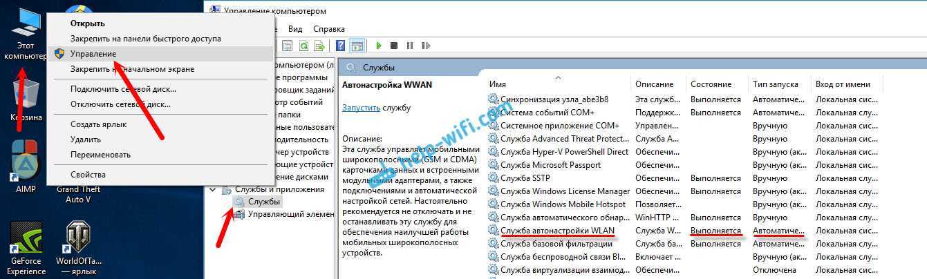 Заходим в службы (правой кнопкой на значок «Этот компьютер» и выбираем «Управление», или через панель управления), переходим в «Службы», находим «Служба автонастройки WLAN», и смотрим в каком она статусе. Она должна быть в статусе «Выполняется», а тип запуска «Автоматически». Вот так: