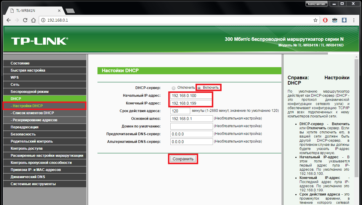 Сперва заходят в интерфейс маршрутизатора. В браузере вводят «192.168.1.1» (или 192.168.0.1), указывают логин и пароль. В настройках заходят в раздел «LAN», ищут пункт «Включение DHCP-сервера», напротив которого должна стоять галочка.