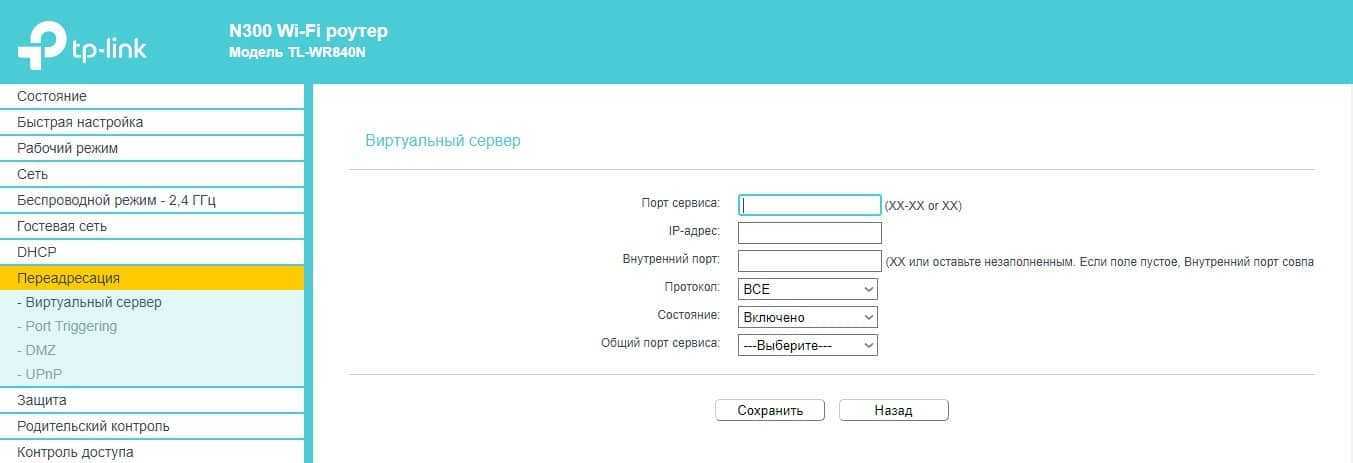 - Переходим на вкладку «Переадресация» в подраздел «Виртуальные серверы».