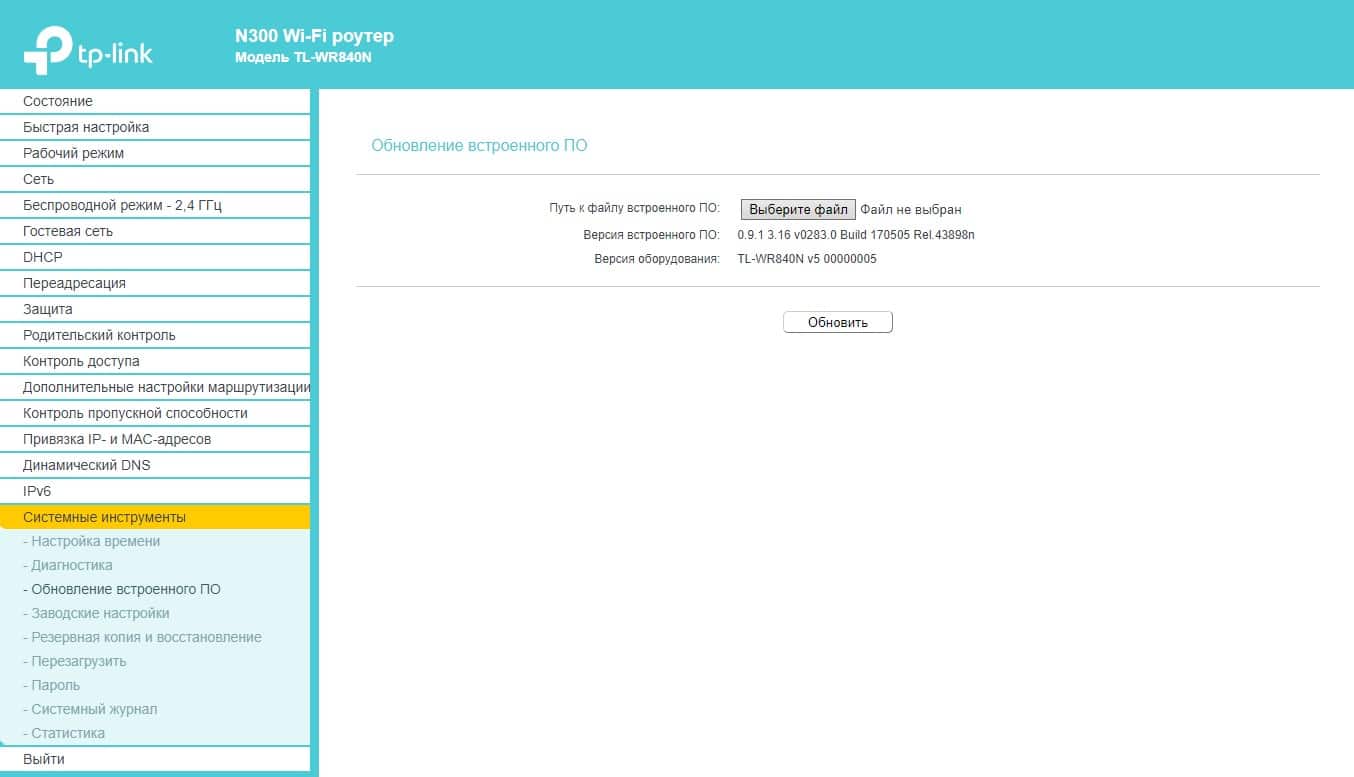 Открываем настройки роутера – «Системные инструменты» — «Обновление встроенного ПО».