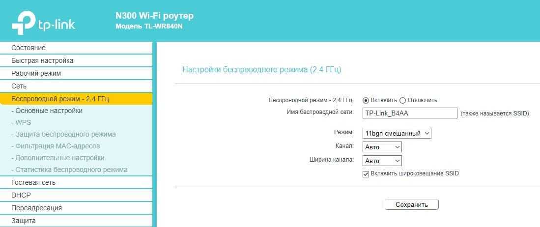 - В разделе «Основные настройки» (чаще находится внутри вкладки «Беспроводной режим») на том же TP-Link указываем имя сети. Также режим (лучше оставить смешанный) и ширину канала. Также есть выбор канала, настройка «Авто» работает неплохо, но если вам нужно максимально ускорить сеть, стоит поискать самый свободный, наименее загруженный канал вручную.