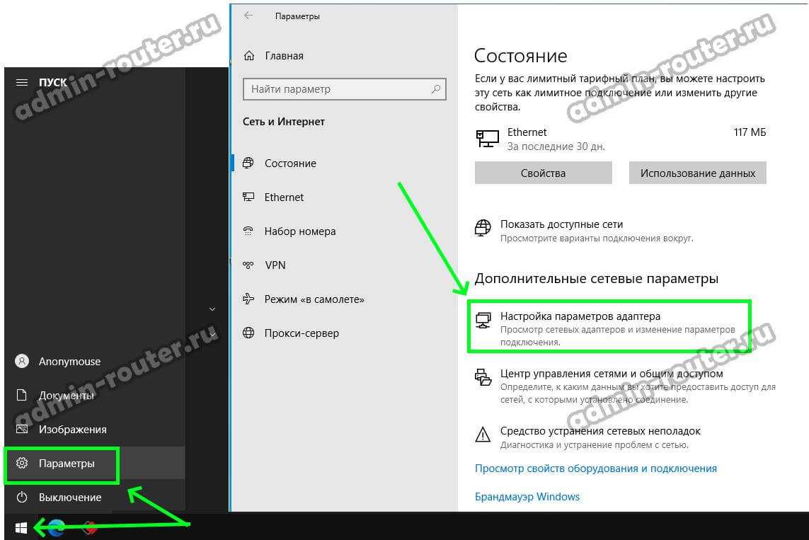 - На Windows 10: запустите приложение «Параметры», откройте раздел «Сеть и интернет», немного прокрутите вниз правую половину окна и кликните «Настройка параметров адаптера».