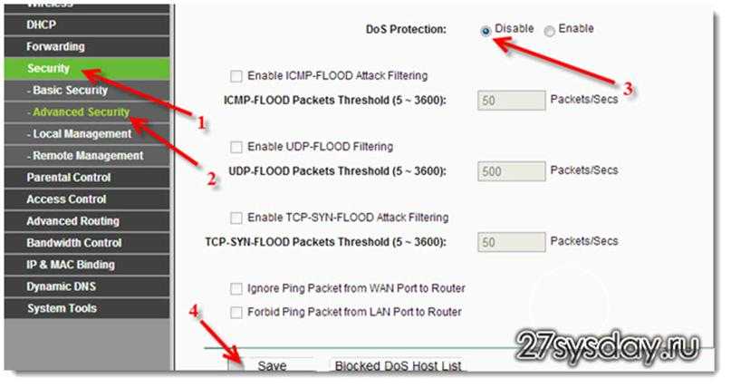 Практически в каждом роутере присутствует защита от DoS атак и не всегда бывает, что она работает корректно. Поэтому ее можно просто отключить.