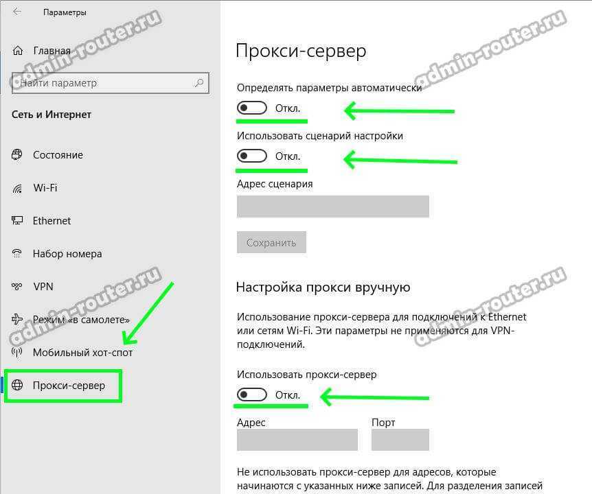 Еще одна сетевая настройка в Windows, о которой не следует забывать, — это прокси-сервер. В домашних сетях прокси-серверы обычно не используются; это удел корпоративных сетей. Поэтому зайдите в настройки системы, раздел «Сеть и Интернет» — «Прокси-сервер» и проверьте, что он отключен как в автоматическом режиме, так и в ручном.