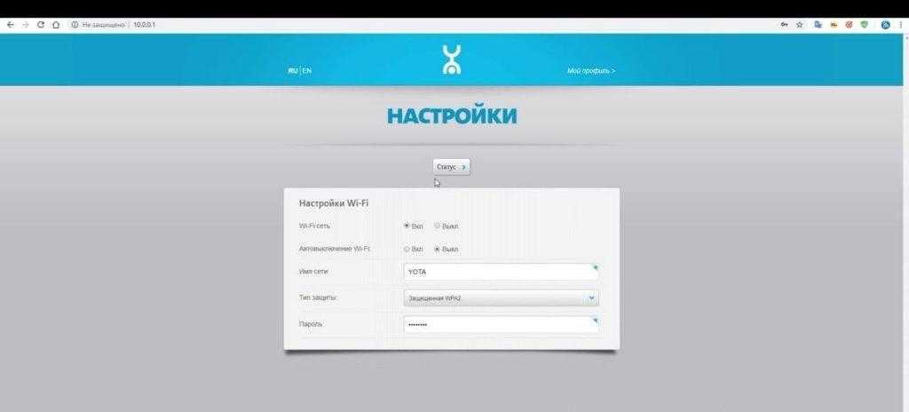 Для того чтобы поменять пароль на Yota Wi-Fi, необходимо пробраться в панель управления модема, подключив его через USB. Адрес входа – status.yota.ru или 10.0.0.1 (рекомендуется использовать первый вариант). На следующем этапе необходимо зайти в настройки Wi-Fi и сменить пароль для беспроводной точки доступа. Здесь же доступен выбор типа защиты, а в одном из полей меняется наименование беспроводной ТД.