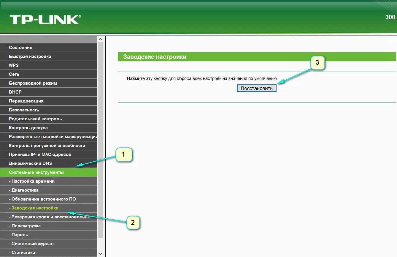 Здесь достаточно просто нажать на кнопку «Восстановить» и роутер обнулится до состояния «из коробки»