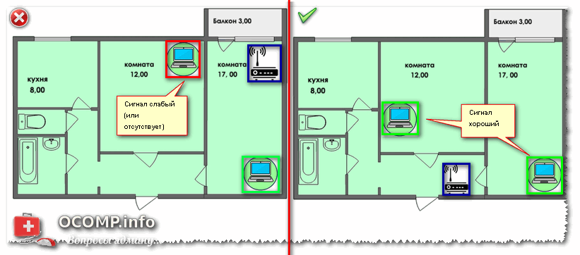 Расположение роутера в квартире: справа — вариант намного удачнее