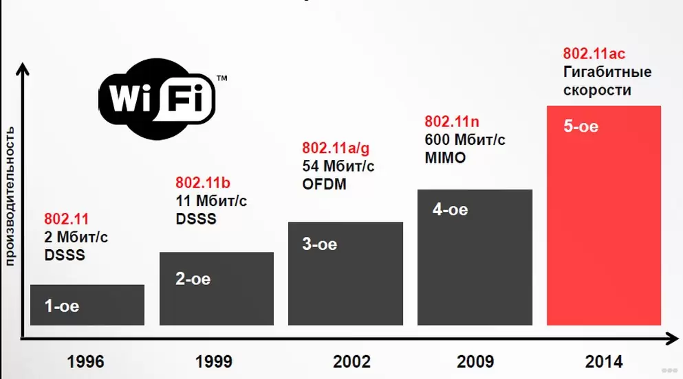 В самом начале появления виртуальной линии показатели скорости переноса данных были довольно низкими. Для выполнения задач применялся радиоканал, функционирующий на скоростях до 1 Мбит/с, в редких случаях — до 2 Мбит/с. Первичный высокочастотный формат был назван IEEE 802.11a, он позволял ускоряться до 54 Мбит/с, что в тот период было очень быстрым показателем. Функционировали устройства с частотой 5 ГГц.