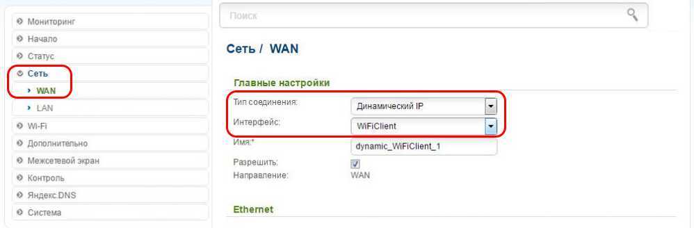 - На втором устройстве в разделе «Сеть» / «WAN» , выставляем Тип подключения «Динамический IP-адрес» . Сохраняем изменения.