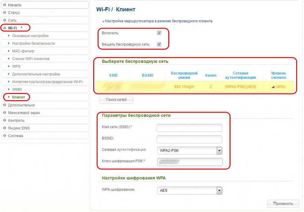 - В разделе Wi-Fi откройте подраздел «Клиент» и установите флажок «Перевести роутер в режим беспроводного клиента».
