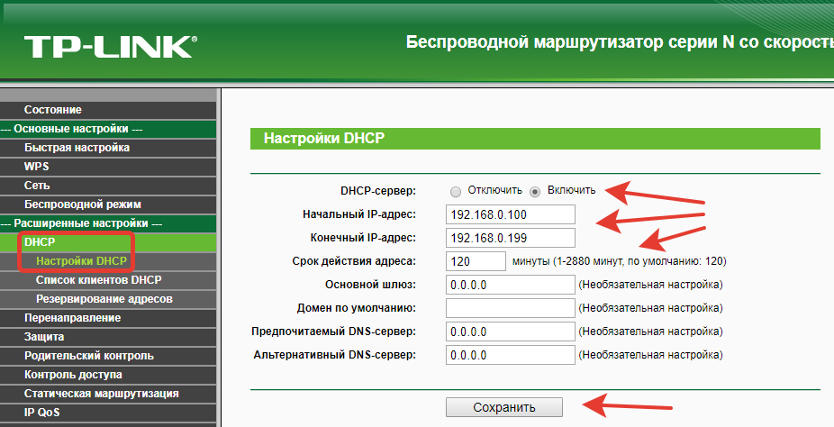 Если DHCP-сервер отключён, то ТВ-устройству, а вместе с тем и другой сетевой технике будет присвоен локальный IP-адрес в автоматическом порядке. Исправить это можно, войдя в настройки роутера. Следует перейти на вкладку DHCP -> «Настройки» и переключить маячок в положение «Включить». Все IP-адреса и шлюзы будут определены сервером в автоматическом режиме.