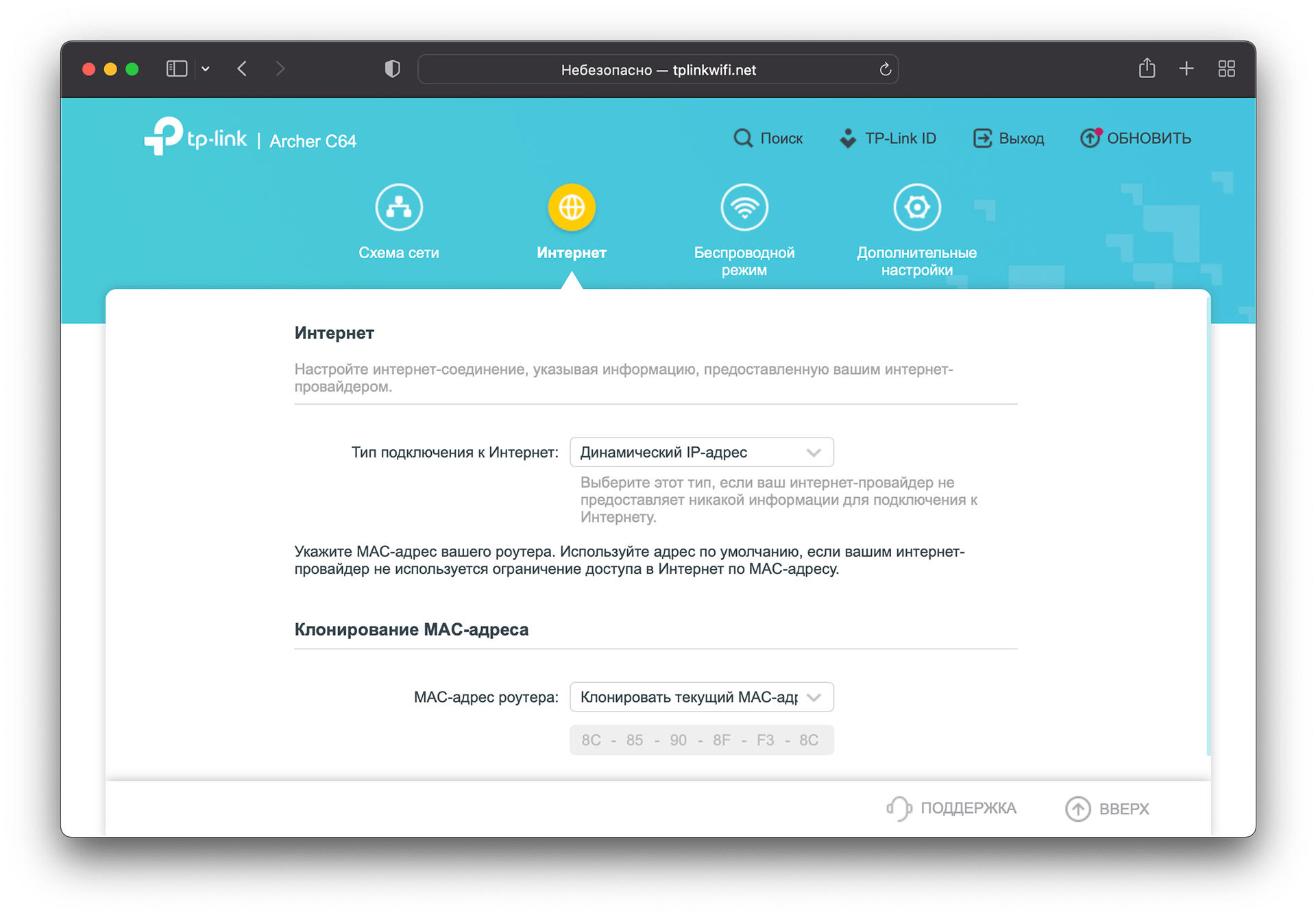 Вторая вкладка — «Интернет», где будет настройка IP и MAC-адресов: