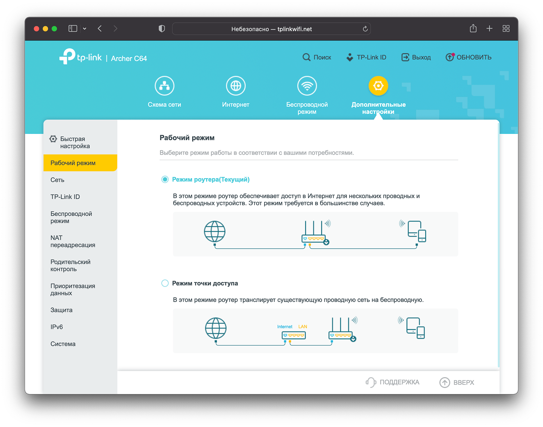 Управление настройками возможно как через браузер, так и через приложение TP-Link Tether, доступное на iOS и Android. Я покажу процесс в браузере.