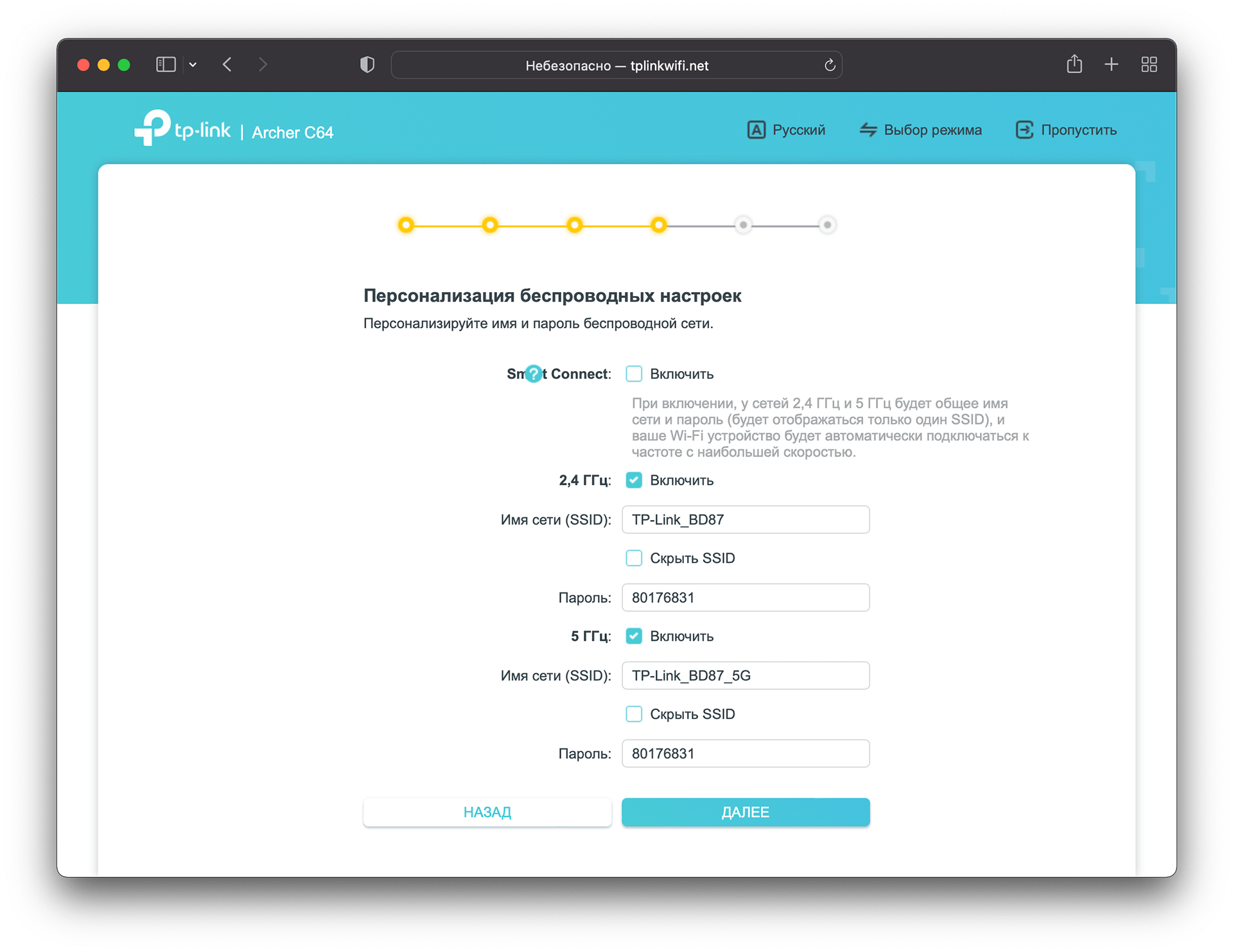 Тут вы сможете придумать имя своей сети и пароль. Прямо во время быстрой настройки: