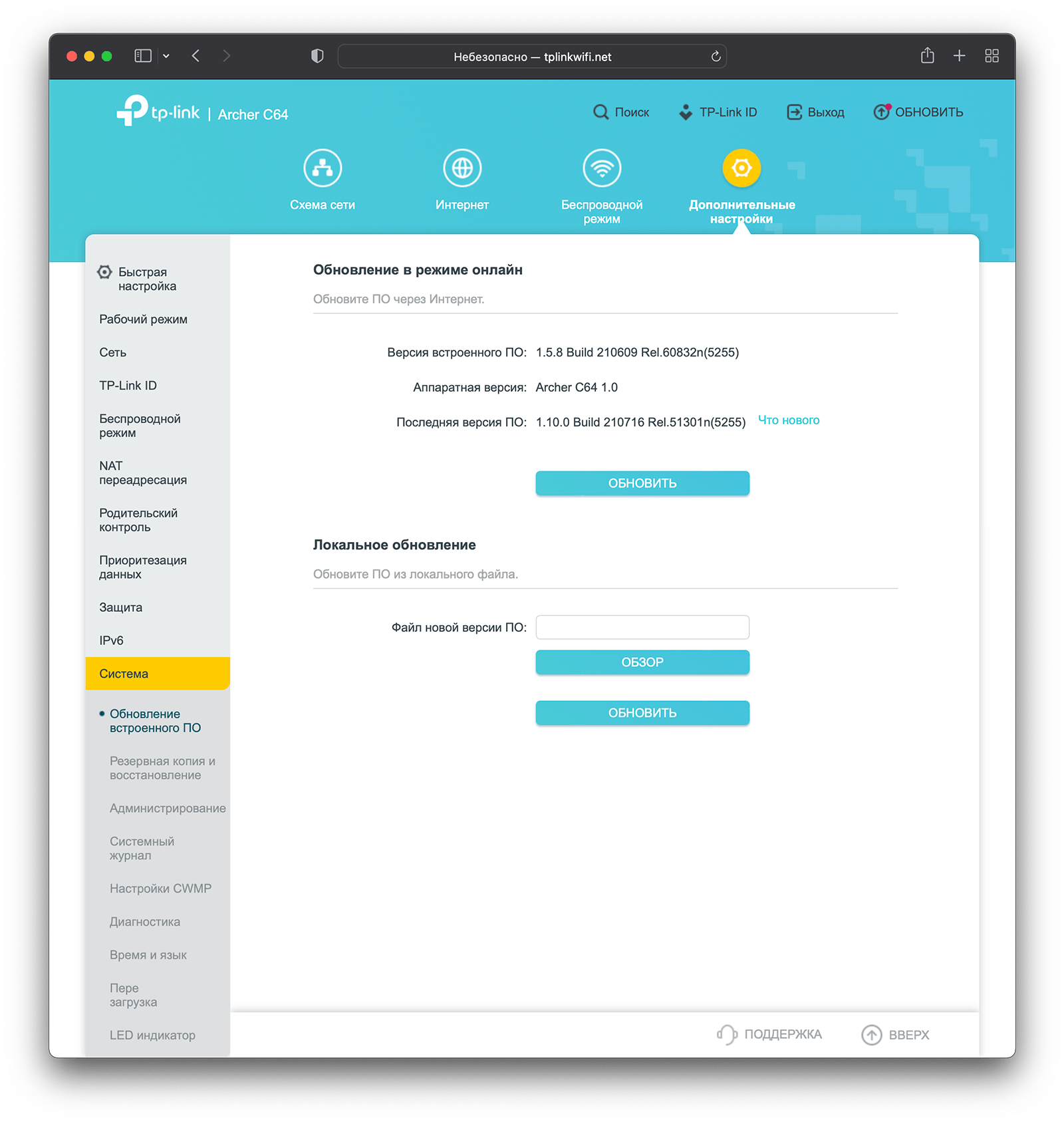 Самый простой способ, доступный для всех моделей Archer, – веб-интерфейс. Заходим во вкладку «Системные инструменты», далее — «Обновление». Откроется рабочая область.