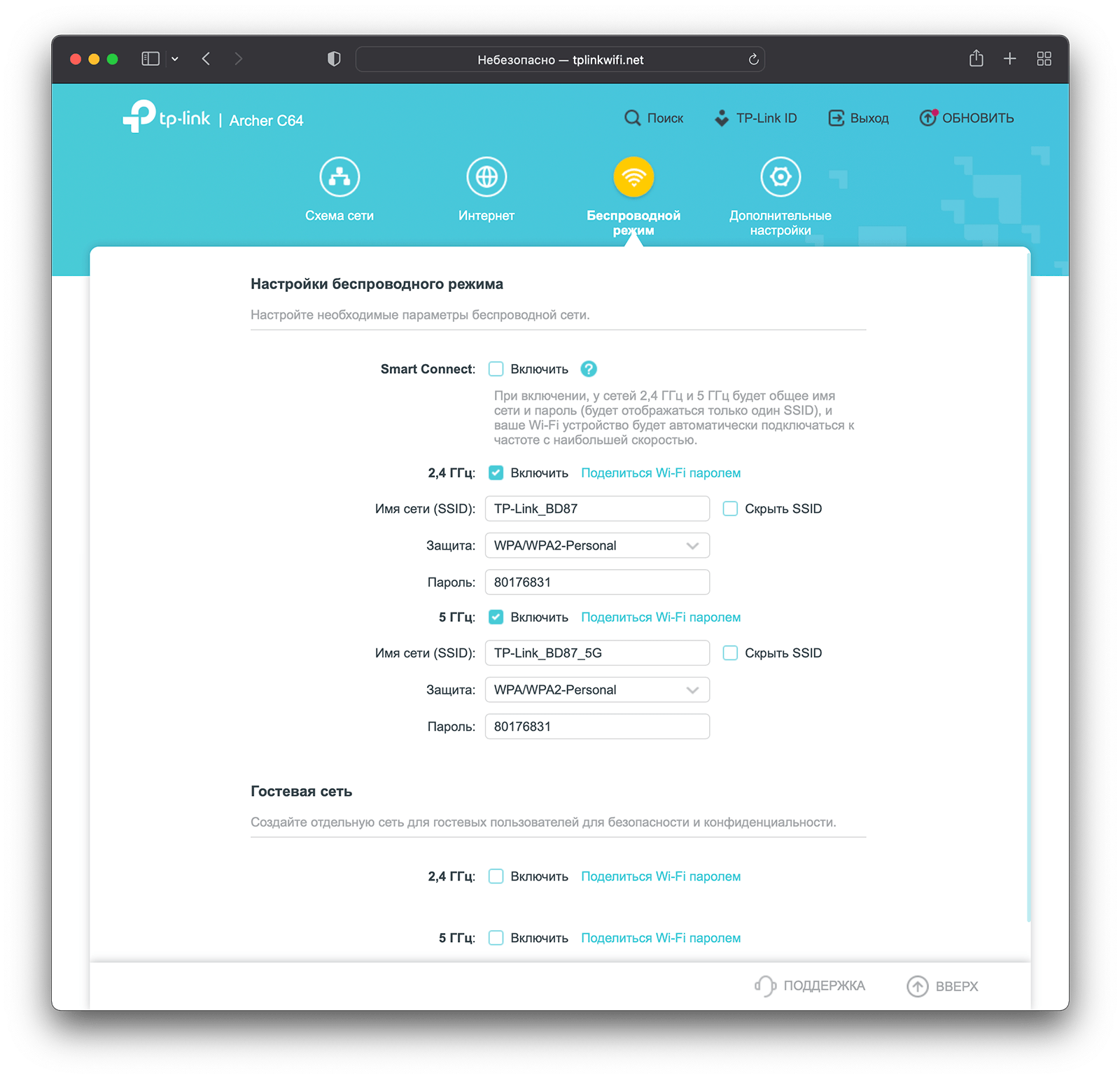 Обратите внимание на функцию Smart Connect. Если её активировать, то ваши сети Wi-Fi, работающие на 2,4 и 5 ГГц, объединяются в одну