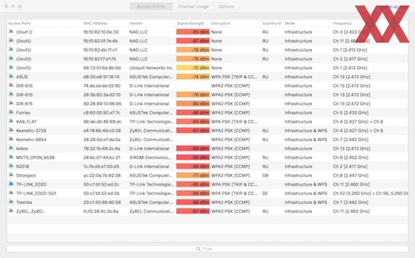 Интерференция от прочих передающих устройств (некритично, но в сочетании с низким уровнем собственного сигнала – плохо). Помехи создают другие точки доступа, более всего сеть домового провайдера Lovit (бывшая Леальта).