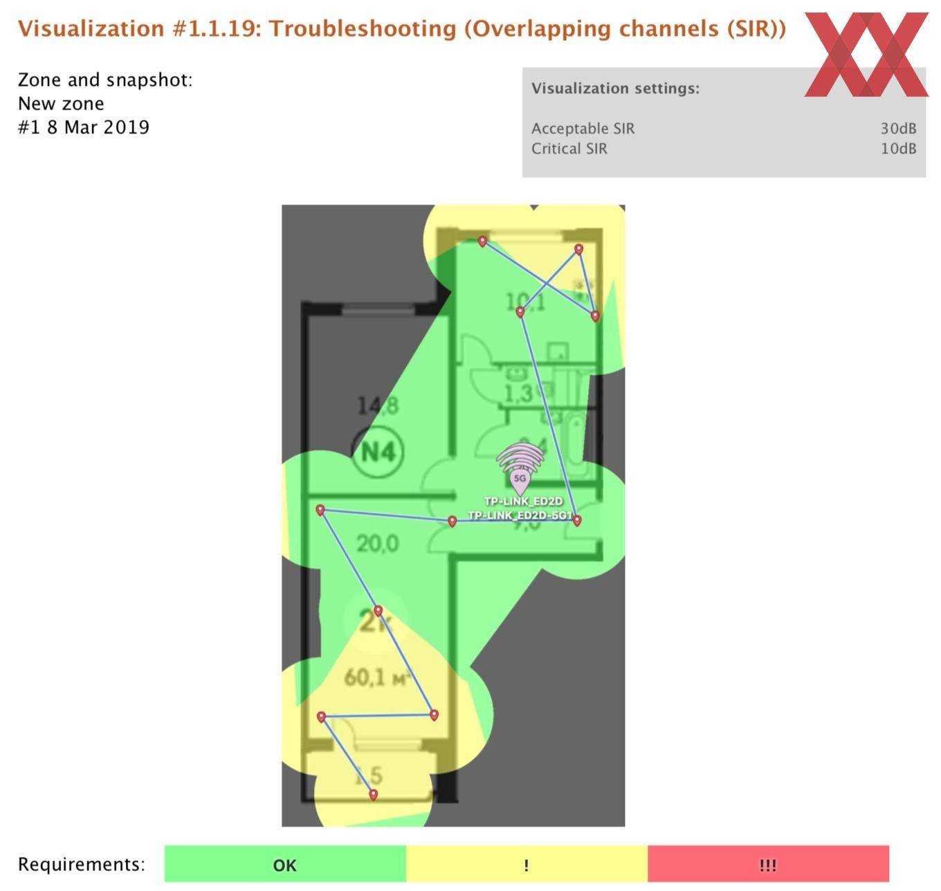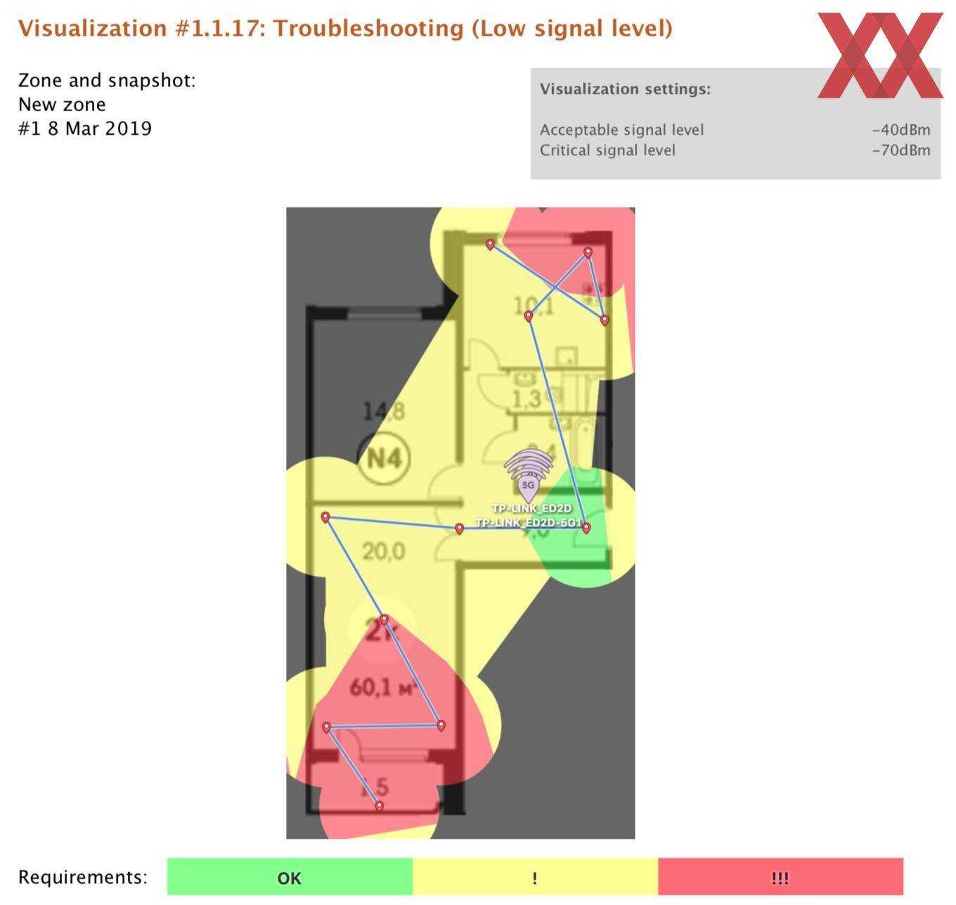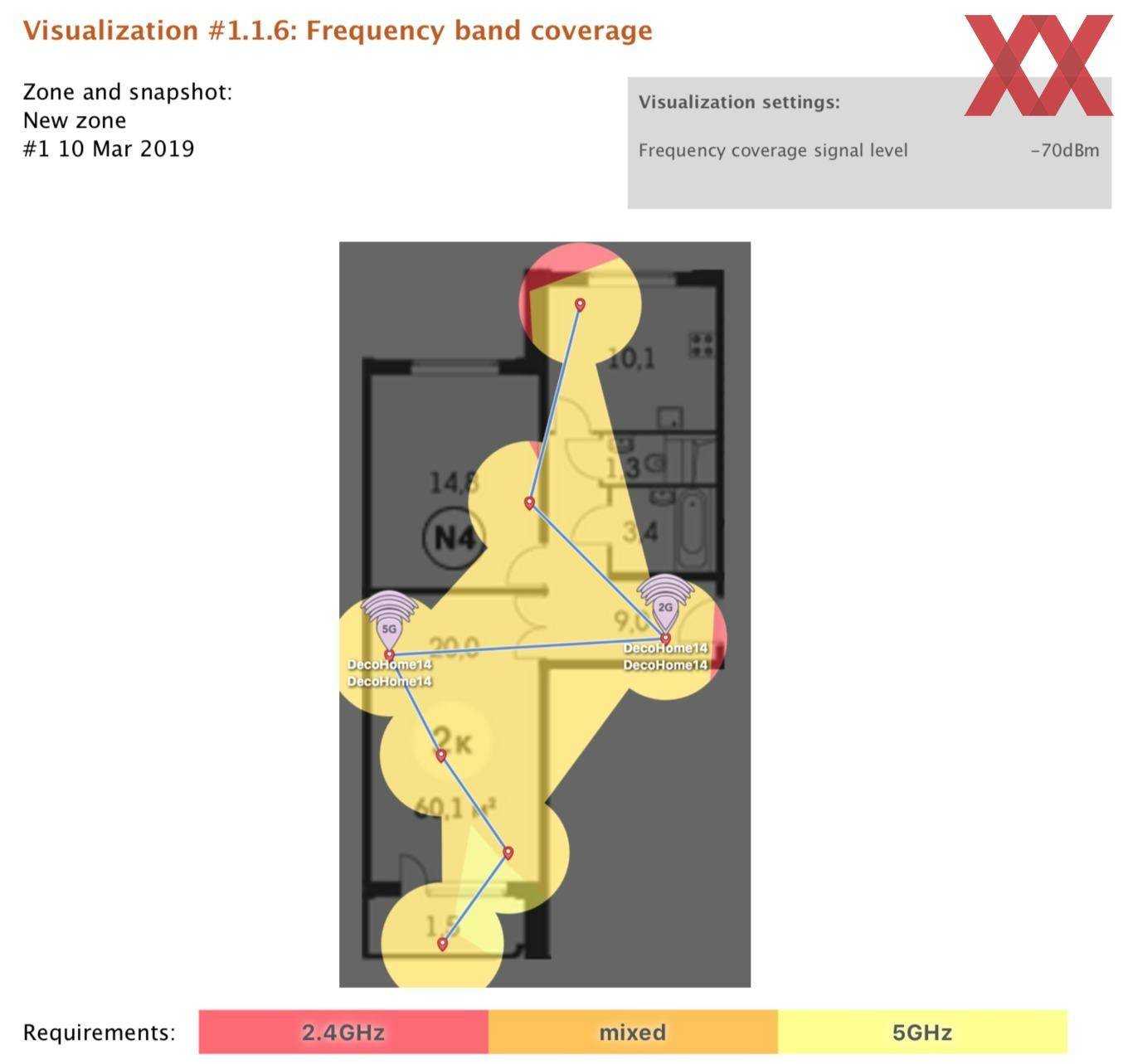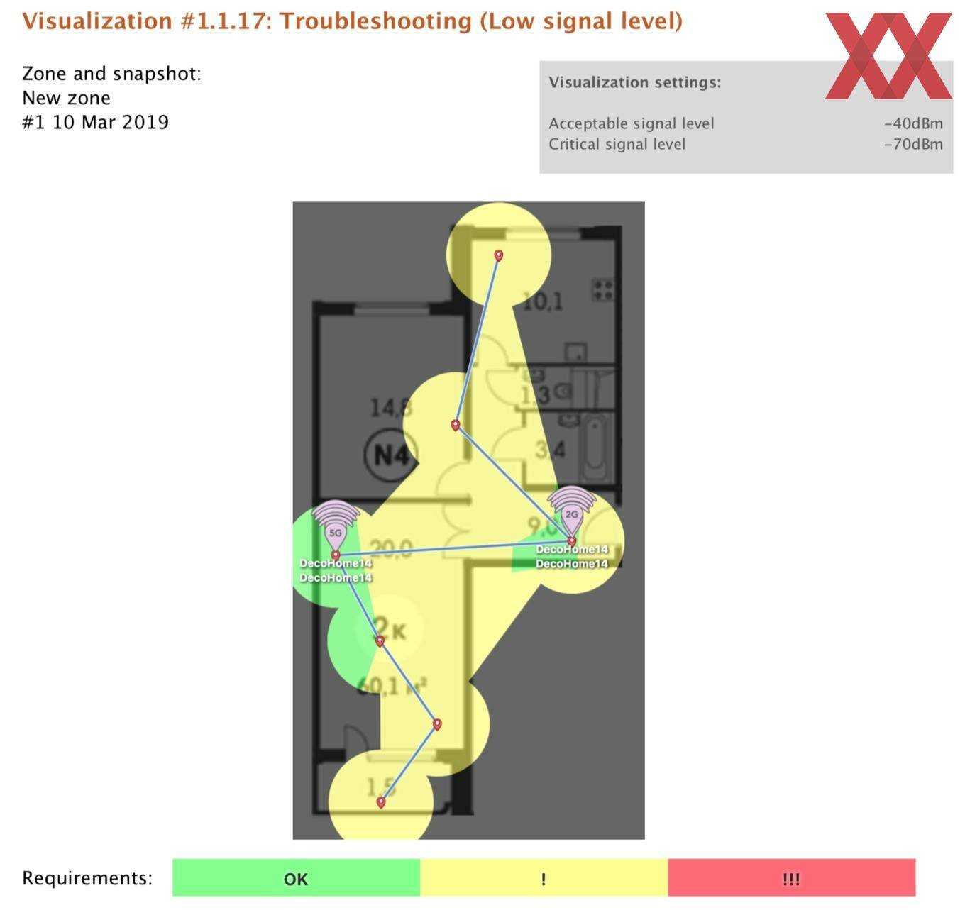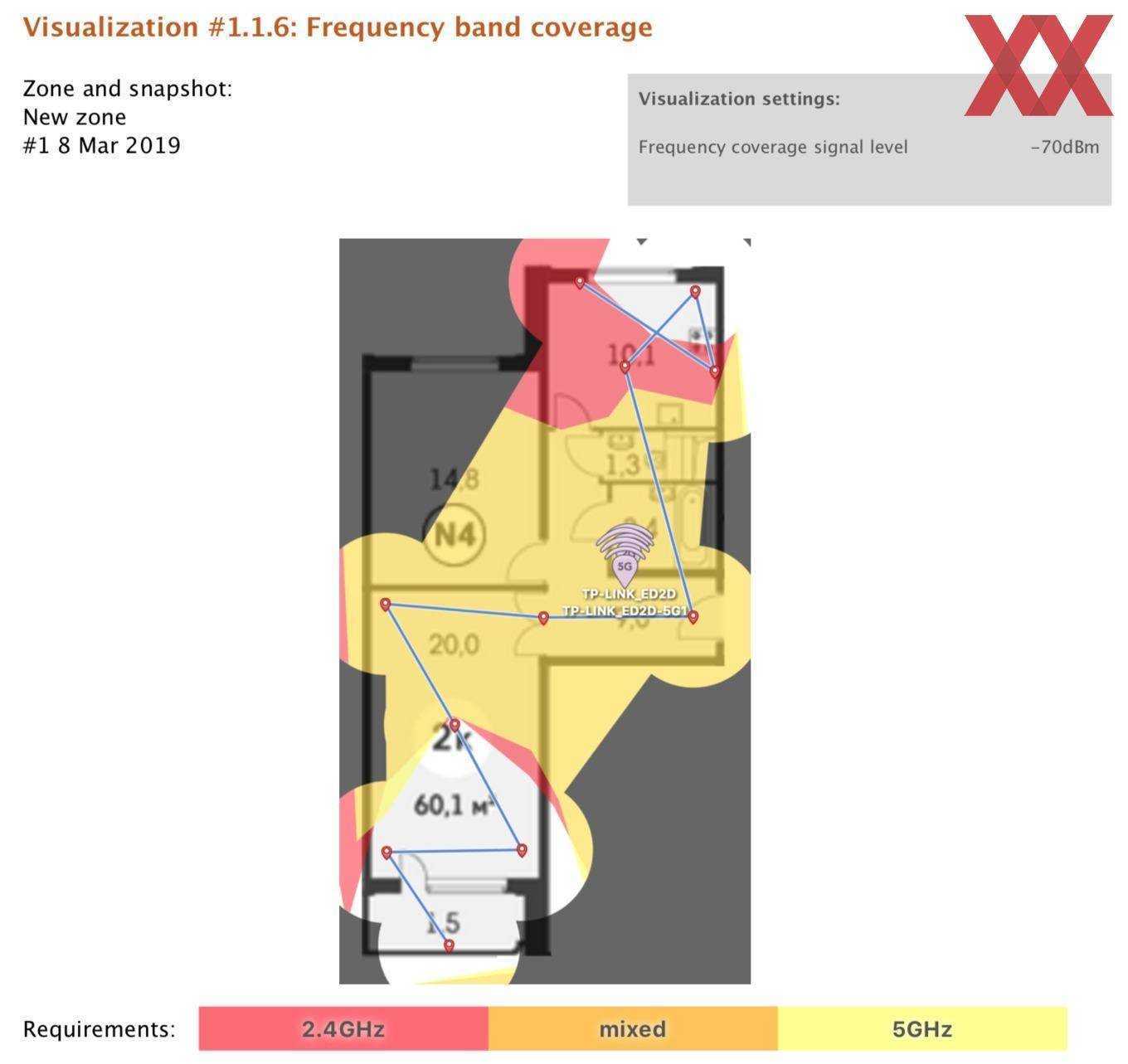 Перед установкой и тестированием Deco M5 был составлен отчёт о состоянии «радиоэфира» с помощью утилиты NetSpot. Ниже представлен план квартиры с обозначенными точками измерений. Если не вдаваться в подробности, то картина получилась неутешительная: