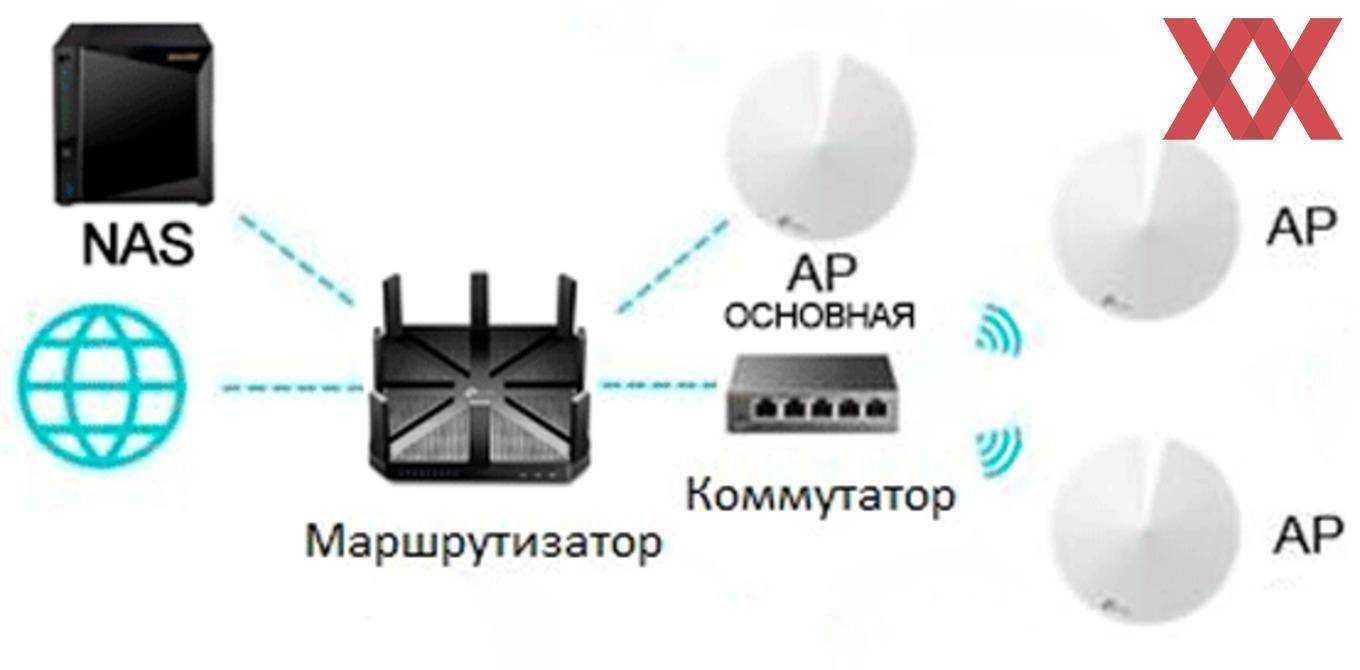 Основная AP проводом подключена к роутеру, дополнительные связаны с ней по WLAN.