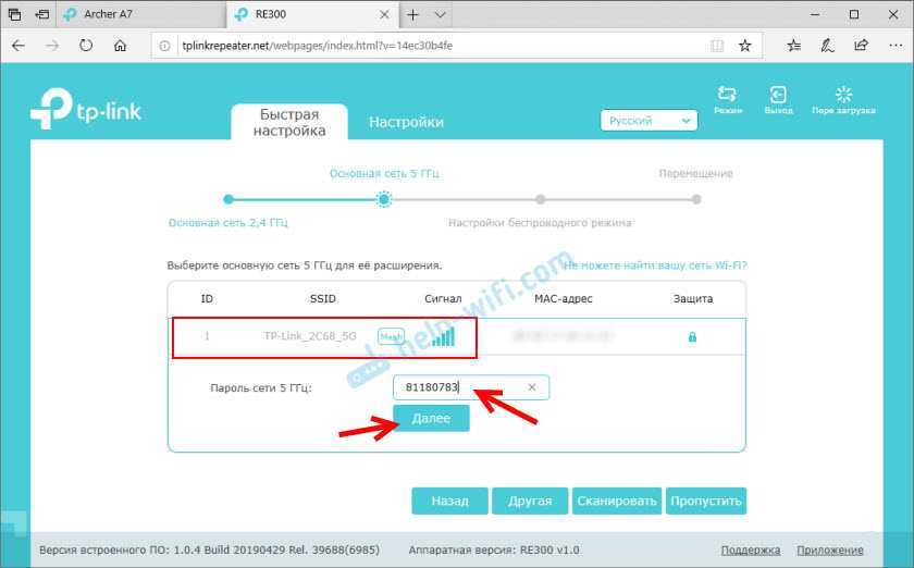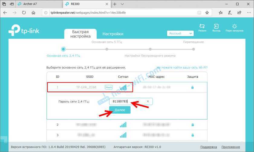 TP-Link RE300 (или другая модель, которая у вас) сразу начнет искать доступные Wi-Fi сети и сначала предложит подключиться к Wi-Fi сети в диапазоне 2.4 ГГц. При необходимости, подключение к сети в определенном диапазоне можно пропустить. Нам нужно выбрать свою сеть и ввести пароль