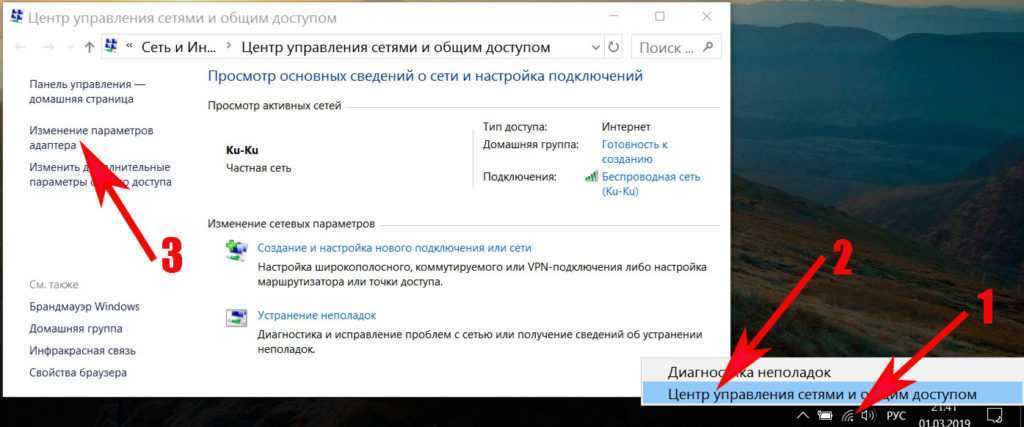 Нажимаем ПКМ на иконке «Сеть», выбираем «Центр управления….», «Изменение параметров адаптера».