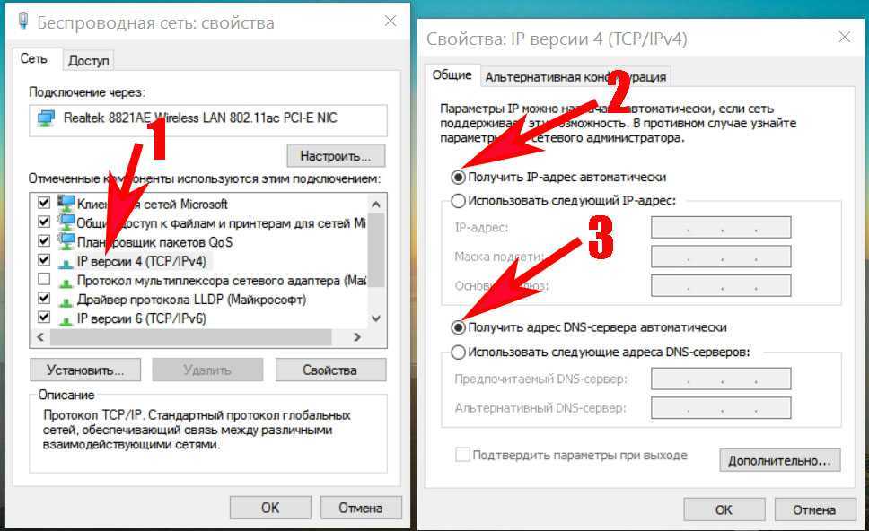 Теперь нажатием выделите строку «IP версия 4…», и клацните кнопку «Свойства». Удостоверьтесь, что точки стоят напротив строк «Автоматически». Пример приведен ниже на картинке.