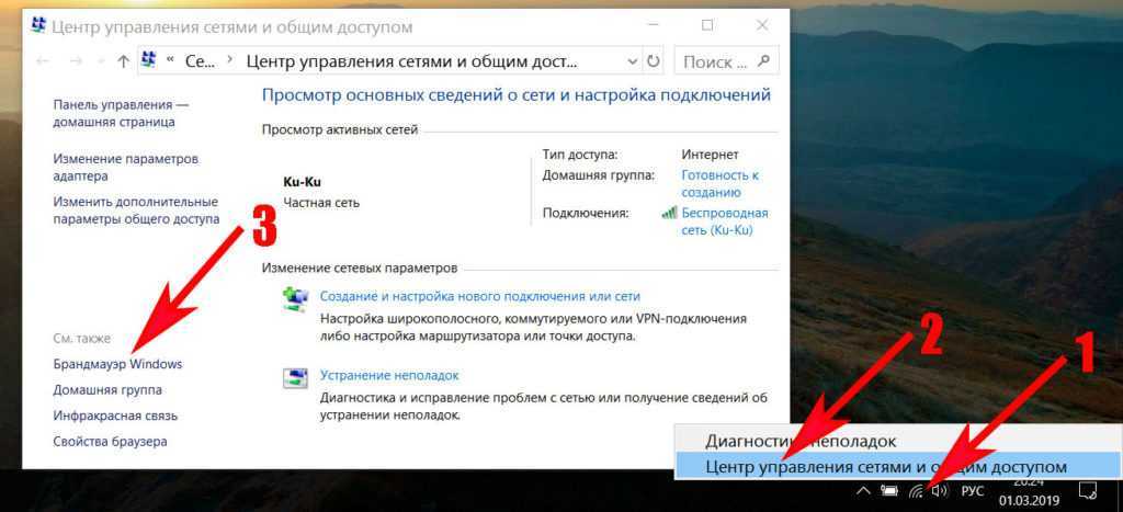 Жмем ПКМ на значке «Сеть», «Центр управления сетями…», «Брандмауэр Windows».