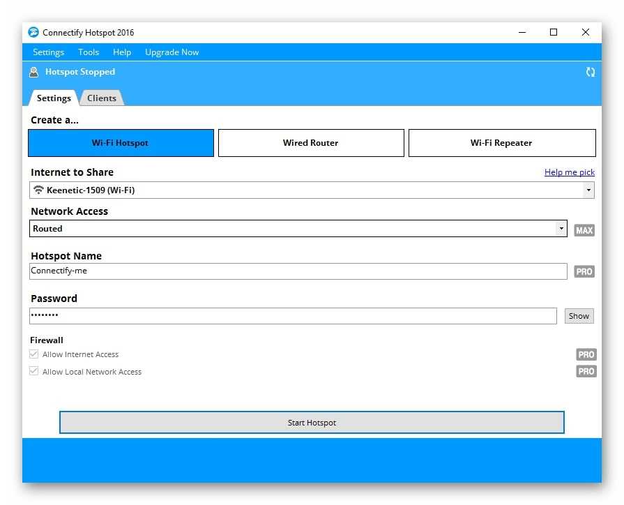 Connectify 2016 для запуска Hotspot на компьютере