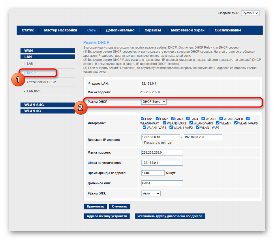 Далее перейдите в категорию «DHCP» и установите флажок «Режим DHCP». В выпадающем меню должно быть значение «DHCP Server», отвечающее за то, что данный режим находится в активном состоянии.