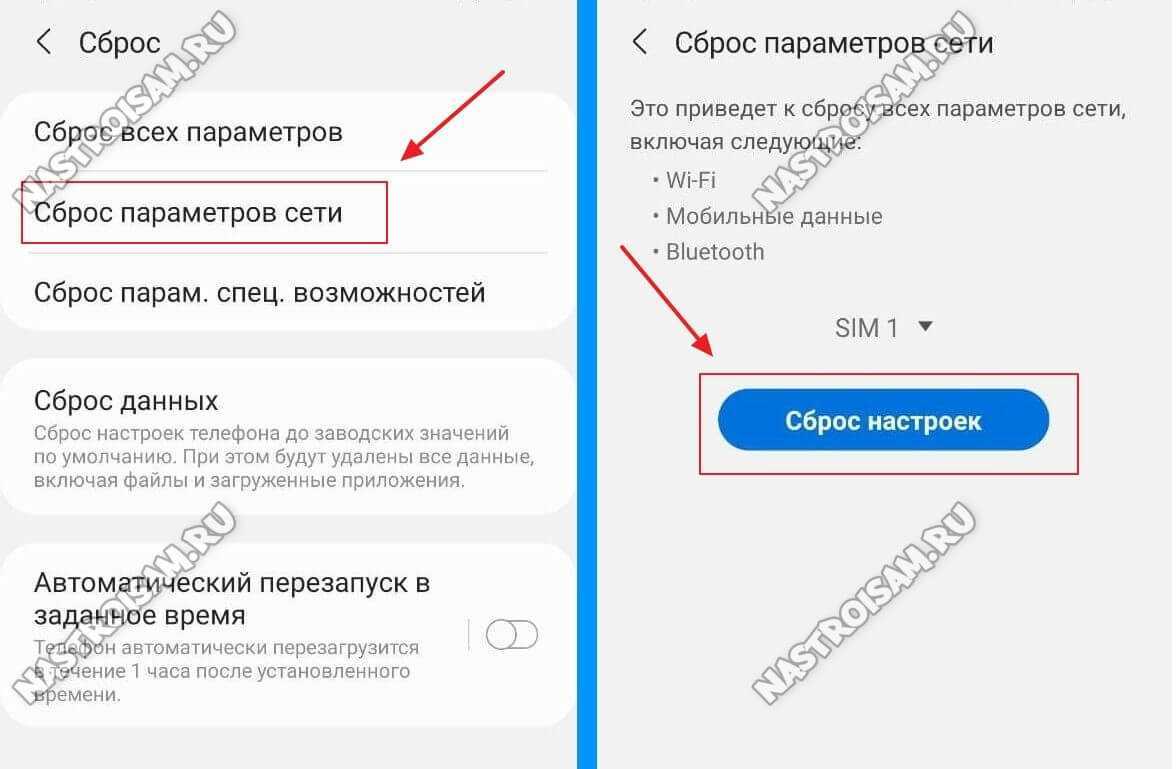 В этом случае может помочь сброс настроек сети. На современных телефонах Самсунг, например, в настройках есть специальный пункт. Если такого пункта нет, придётся делать полный сброс настроек смартфона к заводским параметрам.
