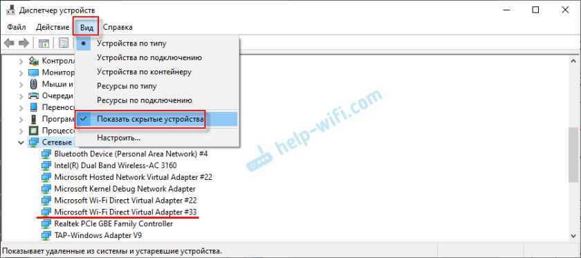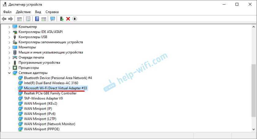 В моем случае, например, Microsoft Wi-Fi Direct Virtual Adapter вообще нет в диспетчере устройств. Ровно до той поры, пока я не запущу мобильный хот-спот (и в диспетчере устройств нажму на кнопку «Обновить конфигурацию оборудования») . После чего он сразу появляется в разделе «Сетевые адаптеры». У меня он с номером #33.