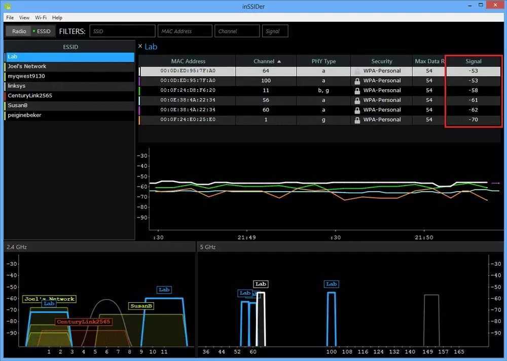 Показ силы сигнала на временном графике. Данная функция поможет понять, когда та или иная сеть работала лучше всего. Это особенно актуально для тех, кто занимается неполадками роутеров и вообще наладкой сетей. Благодаря такому графику можно понять, что стало причиной плохой работы той или иной Wi-Fi сети.