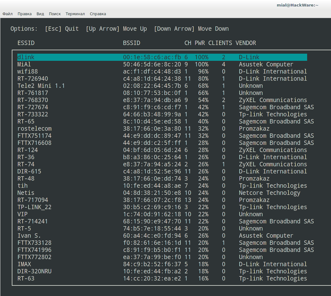 В нём выберите (стрелочками вверх-вниз) беспроводную сеть для атаки и нажмите ENTER. Чтобы выйти нажмите ESC.
