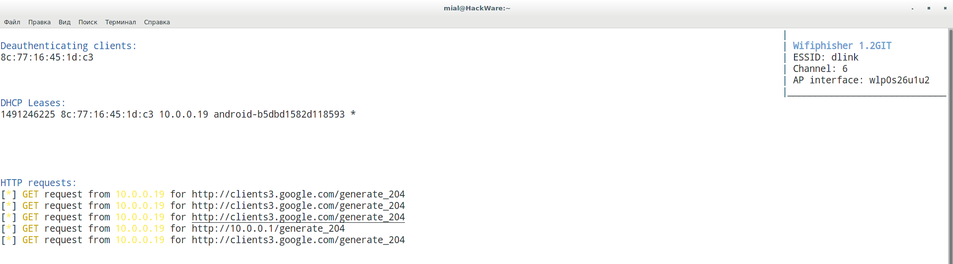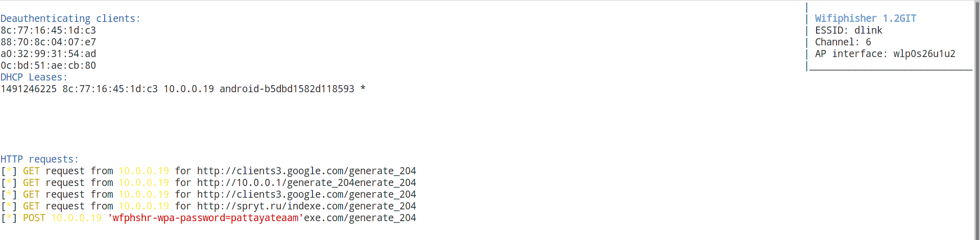 Строка deauthenticating clients показывает клиентов, для которых глушиться Wi-Fi (т. е. создаётся препятствие для подключения к оригинальной точке доступа). А строка DHCP Leases показывает тех, кто уже подключился к Злому Двойнику. HTTP requests показывает запросы, которые были сделаны клиентами.