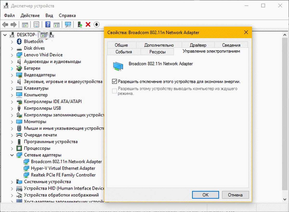 снимите галочку с пункта «Разрешить отключение этого устройства для экономии энергии»