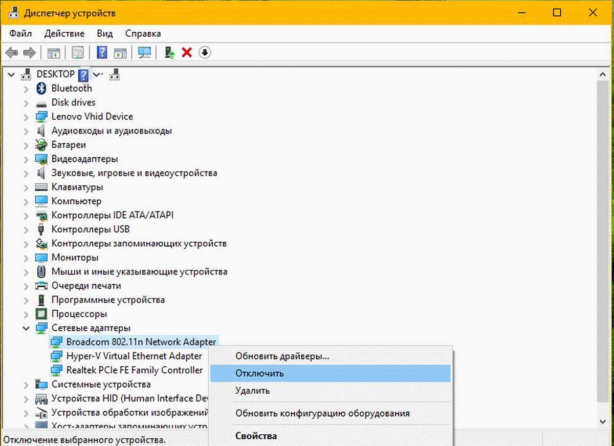 Кликните правой кнопкой мыши на записи Беспроводного адаптера, а затем нажмите Отключить