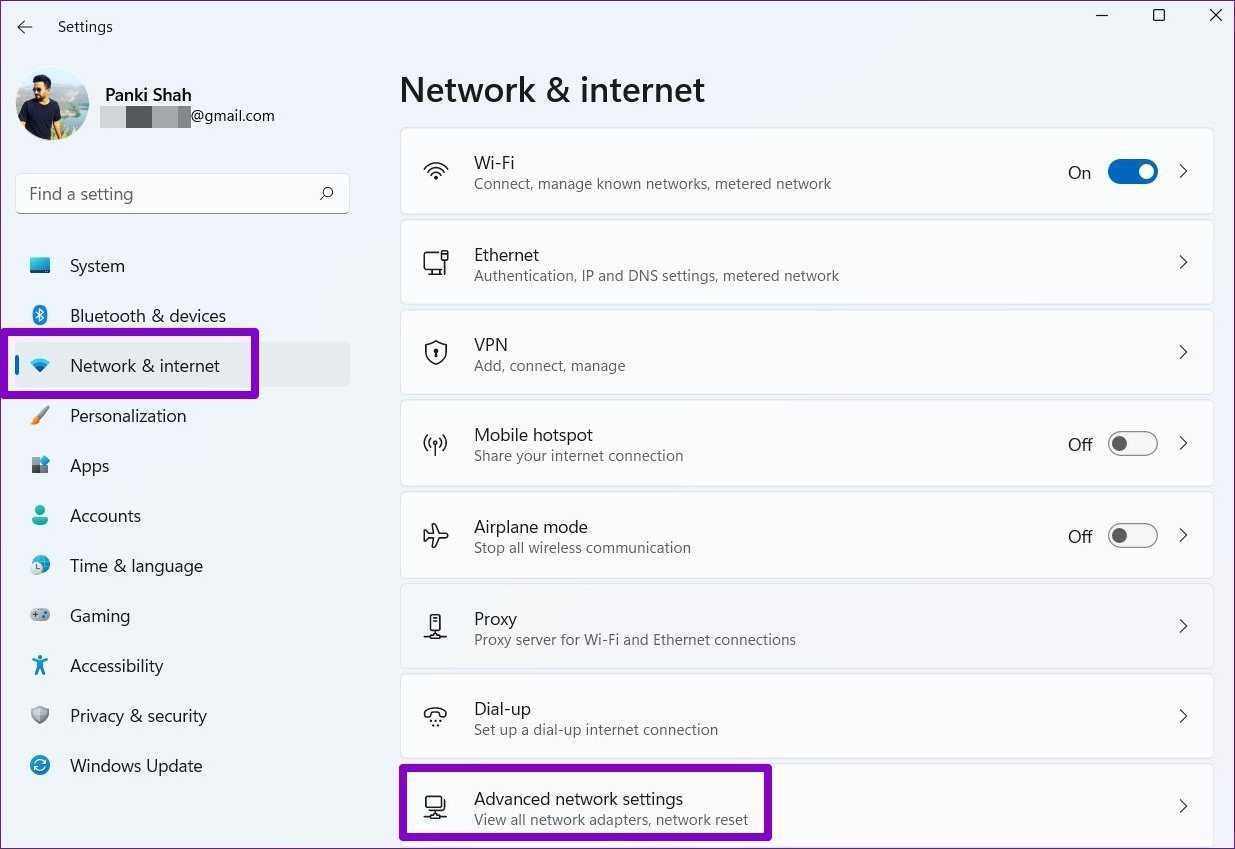 Шаг 1: Нажмите клавишу Windows + I, чтобы запустить приложение «Настройки». Перейдите на вкладку «Сеть и Интернет» слева и перейдите в «Дополнительные параметры сети».