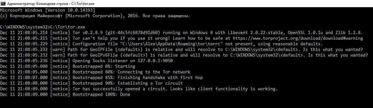 Откройте командную строку Windows (как администратор) и перетащите туда файл tor.exe из скаченного архива, дождитесь, пока Tor завершит свои дела: