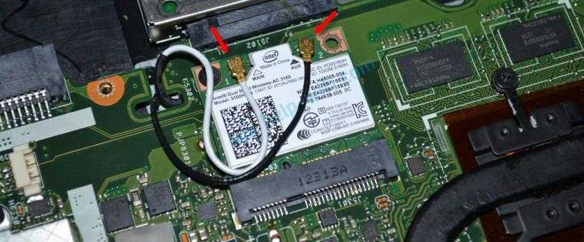 К самому модулю подключено два проводка. Обычно там один белый, а второй черный. Это Wi-Fi антенны. Нам нужно их отсоединить.