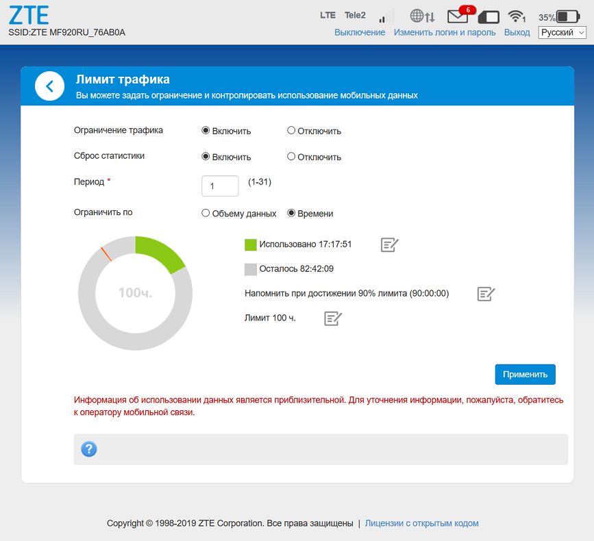 В инструкции по эксплуатации роутера ZTE MF920 не описано, как настроить доступ к интернету, поскольку он устанавливается автоматически. Но кликнув по кнопке «Настройки» в окне статуса сети, можно поменять некоторые параметры (хотя провайдер такие действия не одобряет):