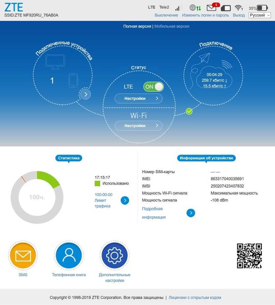 На стартовой странице представлено три элемента в виде круга: в первом указывается, сколько и какие устройства подключены к беспроводной сети, во втором – статус устройства с кнопками перехода к настройкам сетевого соединения и беспроводной сети, в третьем – статус текущего подключения: сколько длится, сколько трафика за это время получено и передано.
