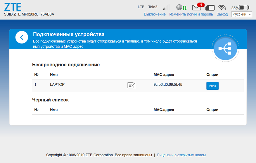 Если кликнуть на элементе с описанием подключённых устройств, откроется страница с более детальной информацией о клиентах и возможностью сформировать свой «чёрный» список устройств, которым будет отказано в доступе к сети.