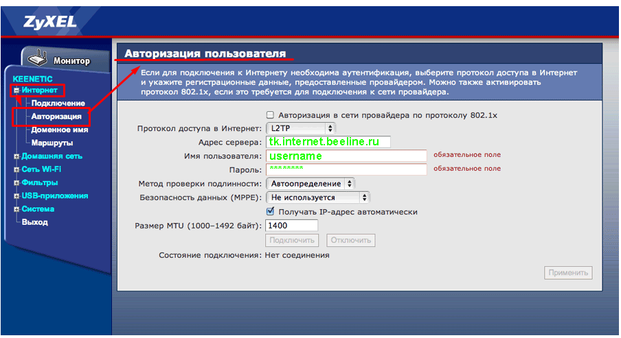 - Поля «Имя пользователя» и «Пароль» заполните в соответствии с информацией, указанной в договоре с провайдером.