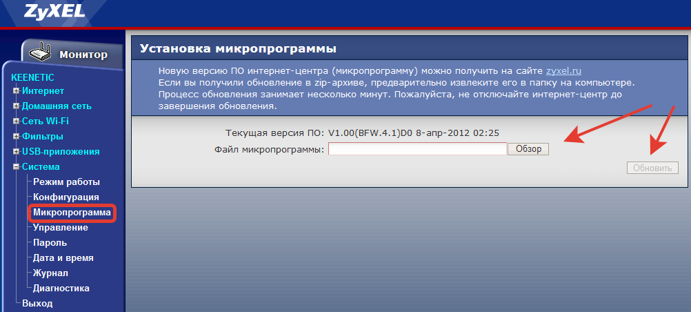 Заходим в веб-интерфейс и переходим в меню «Система» – «Микропрограмма».