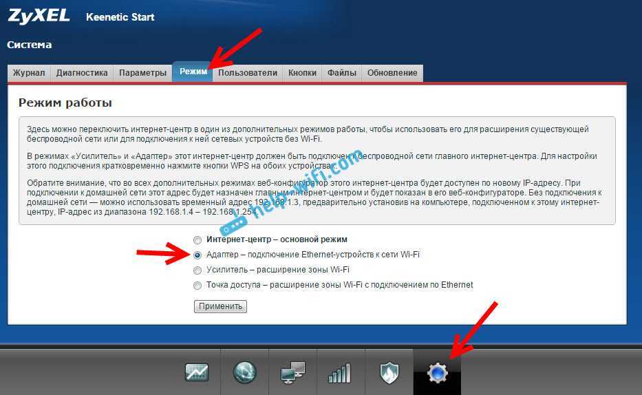 По этому адресу уже можно зайти в настройки. Правда, не вижу никакой необходимости туда заходит. Разве что вернуть роутер в нормальный режим работы. Это можно сделать в настройках, на вкладке Система — Режим. Выбрав режим работы Интернет-центр – основной режим и нажав кнопку Применить.